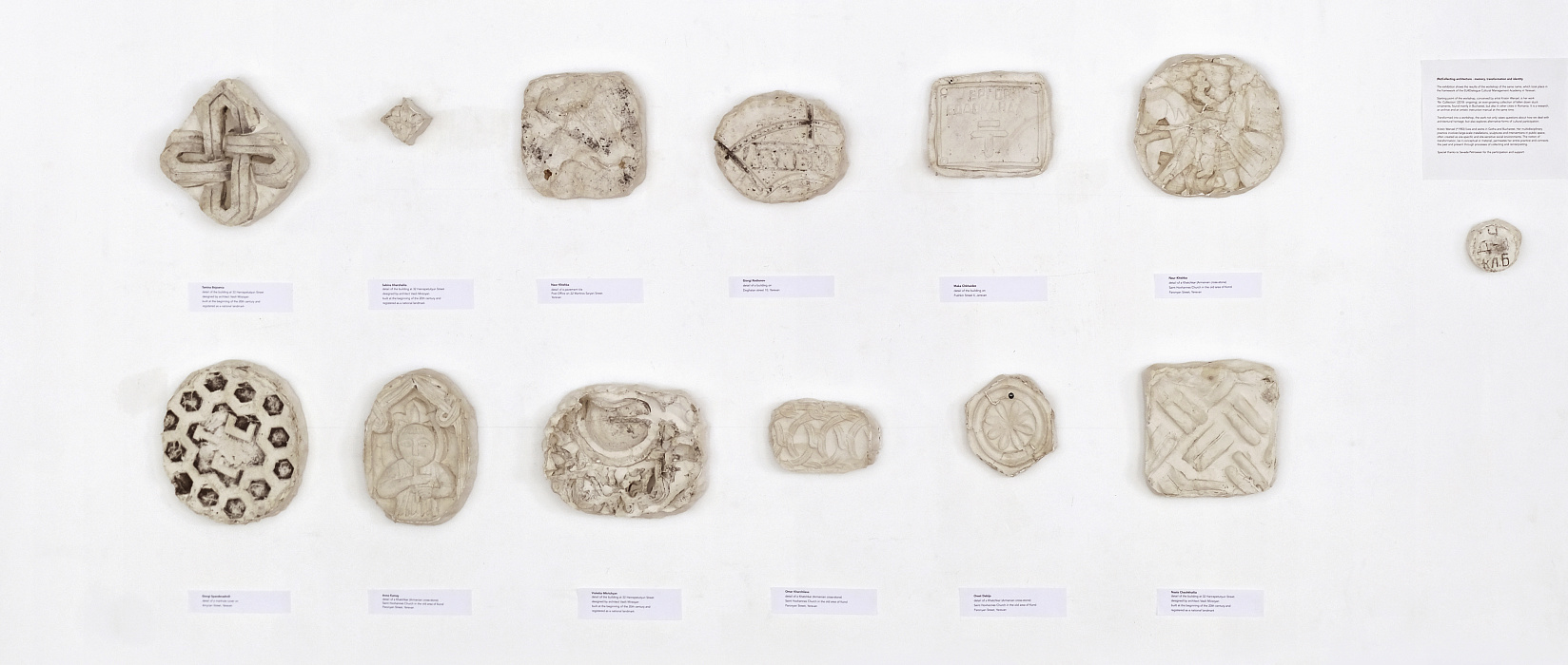 Bucharest-based artist Kristin Wenzel, in partnership with students from the Tbilisi State Academy of Arts and Ubani, organized a workshop to explore the decorative elements of Tbilisi through a collective walk. Participants employed basic molding techniques during this walk to gather small architectural fragments. The process sought to establish a tangible connection between individual experiences and shared memories, interpreting the architecture as a cultural symbol and a space for communal engagement.
